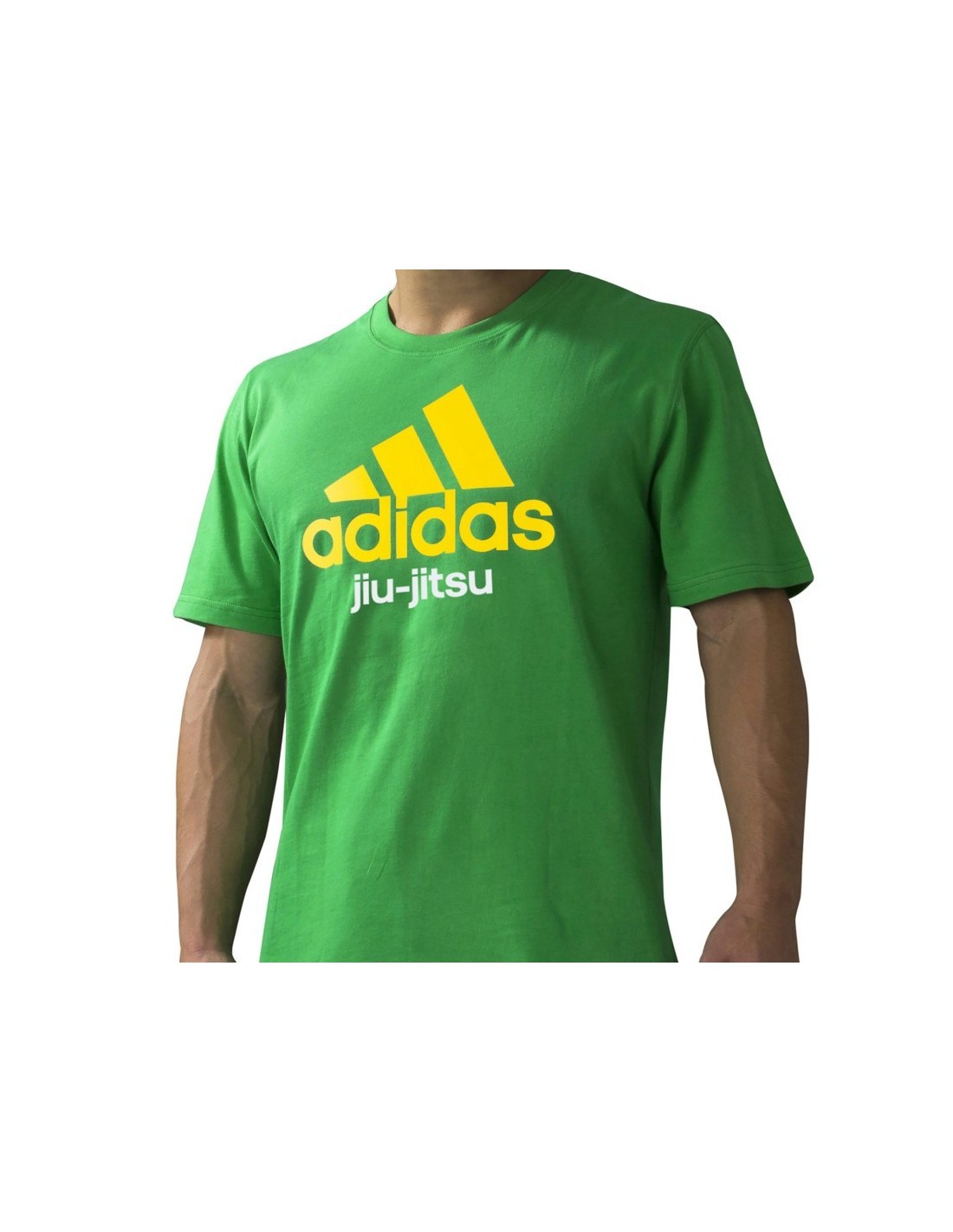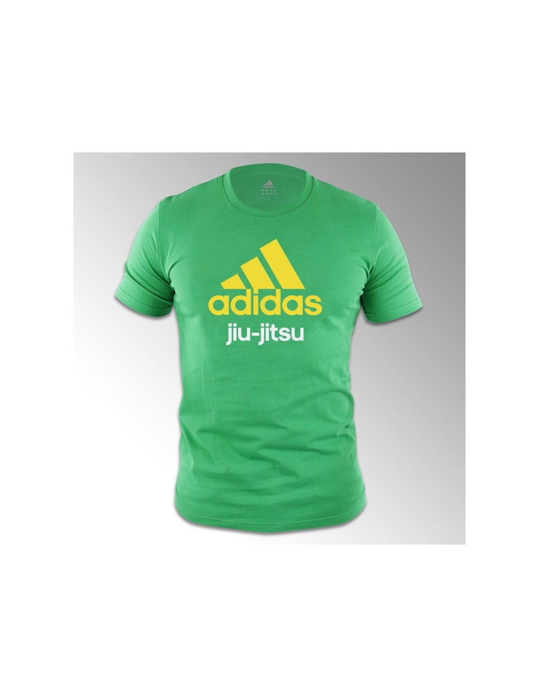 T-Shirt Premium- 30 simples, 170 g/m2. 100 % coton peigné. Impression par sérigraphie directe au niveau du torse. Bande «ADIDAS JIU-JITSU» contrastée dans l’encolure et boucle adidas tissée sur la manche. Coloris : vert.