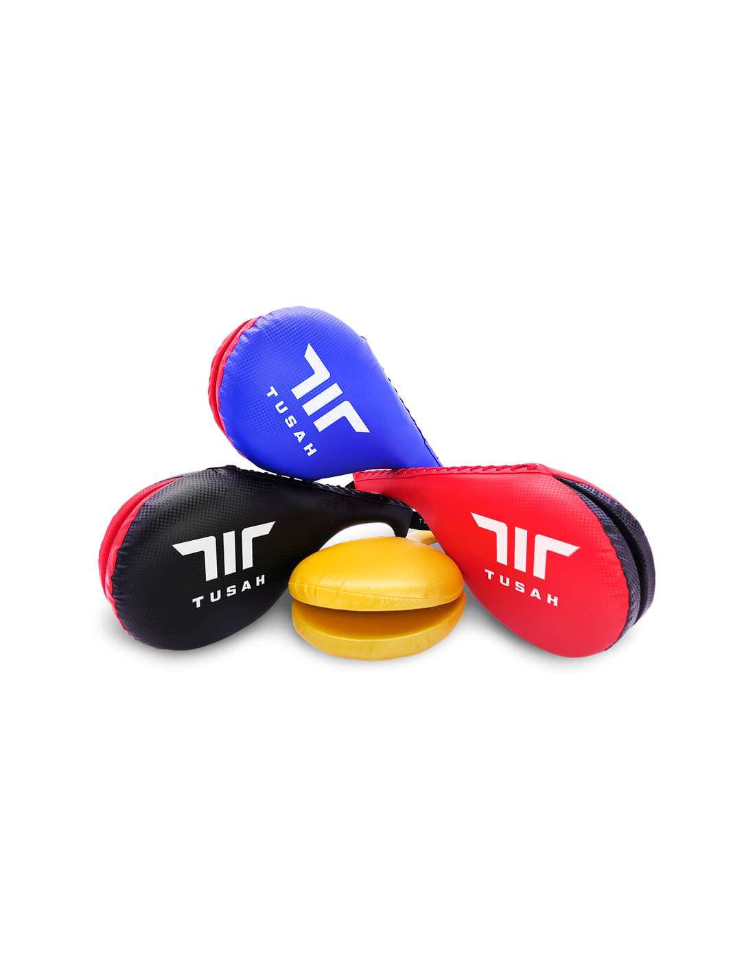 La cible à double coup de pied Tusah est faite de mousse et recouverte de PU. La palette a été imprimée avec le logo Tusah.