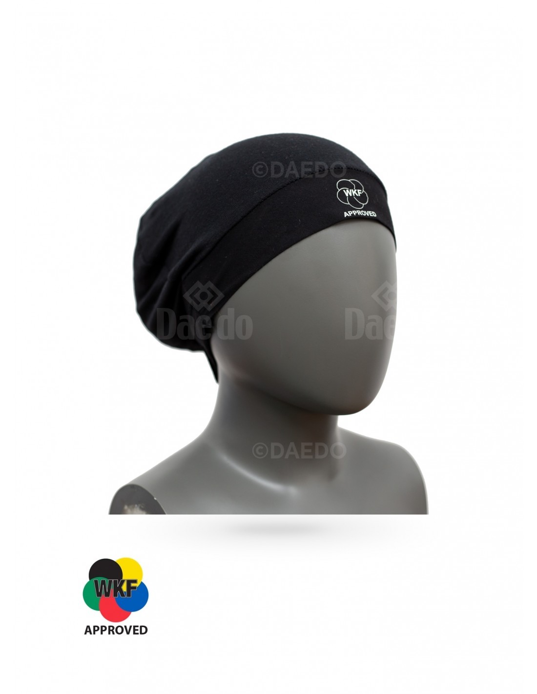 Hijab approuvé par la WKF. Le hijab est fixé à l'aide d'un jeu de fermetures velcro dans le dos
