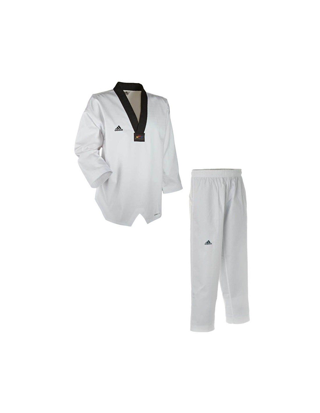 Kimono 35 % coton / 65 % Polyester. Tissus spéciaux à structure tissée. Col veste en V. Pantalon doté d’une bande élastiquée et d’une cordelette de serrage.