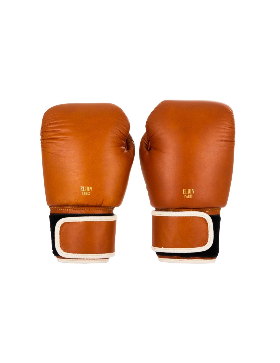Genaaid van een mat en vintage bruin leer, een vleugje romig beige, sober versterkt door een gouden "ELION Paris"-logo, demonstreert het Parijse merk zijn knowhow met een paar high-end bokshandschoenen allemaal in soberheid, om de essentie van een bokshandschoen naar voren te brengen.
