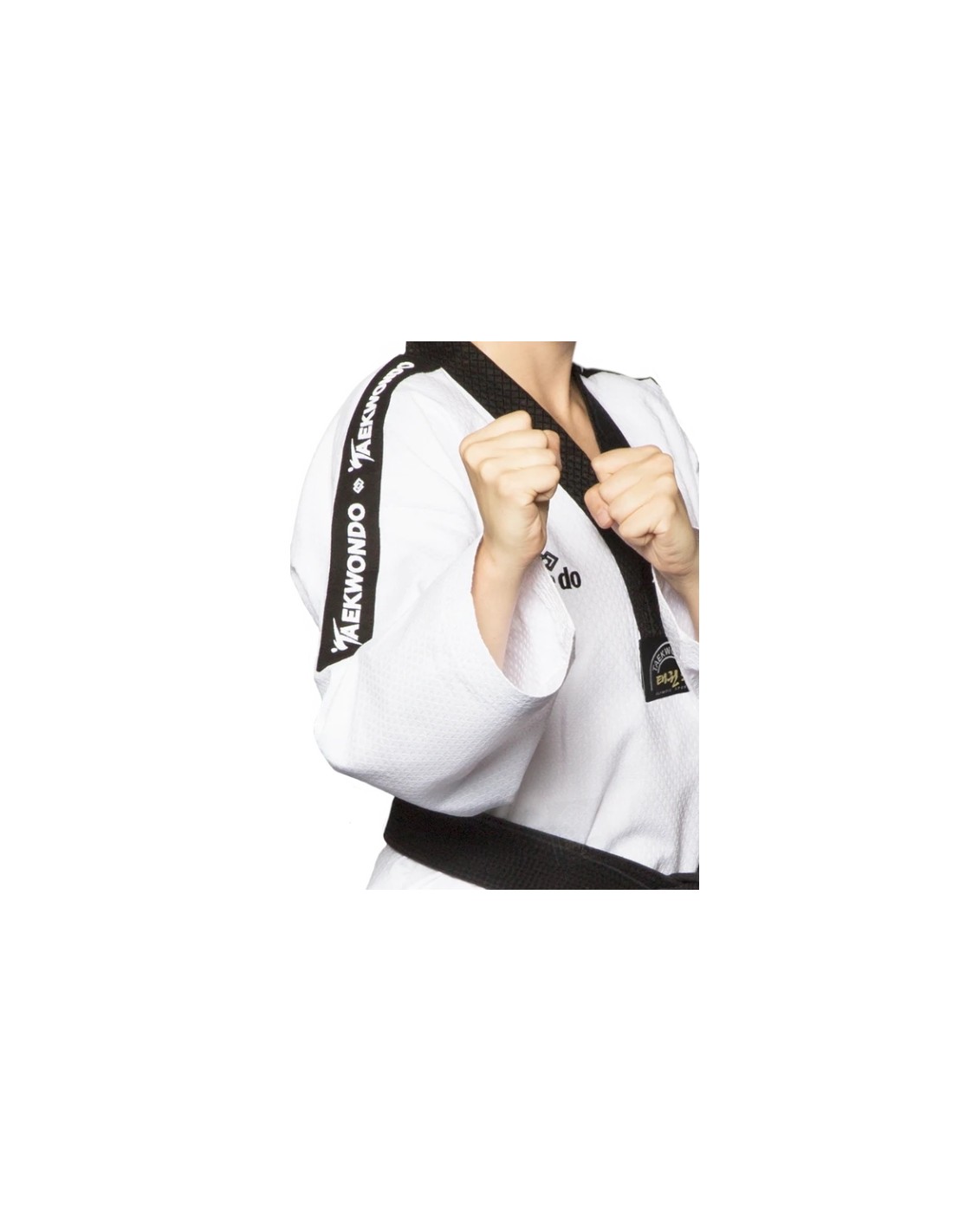 “Taekwondo” competitie dobok van hoogwaardig materiaal met sterpatroon. “Taekwondo”-zijstrepen, minimalistisch ontwerp zonder opdruk op de rug. Licht, duurzaam en comfortabel voor training en competitie.