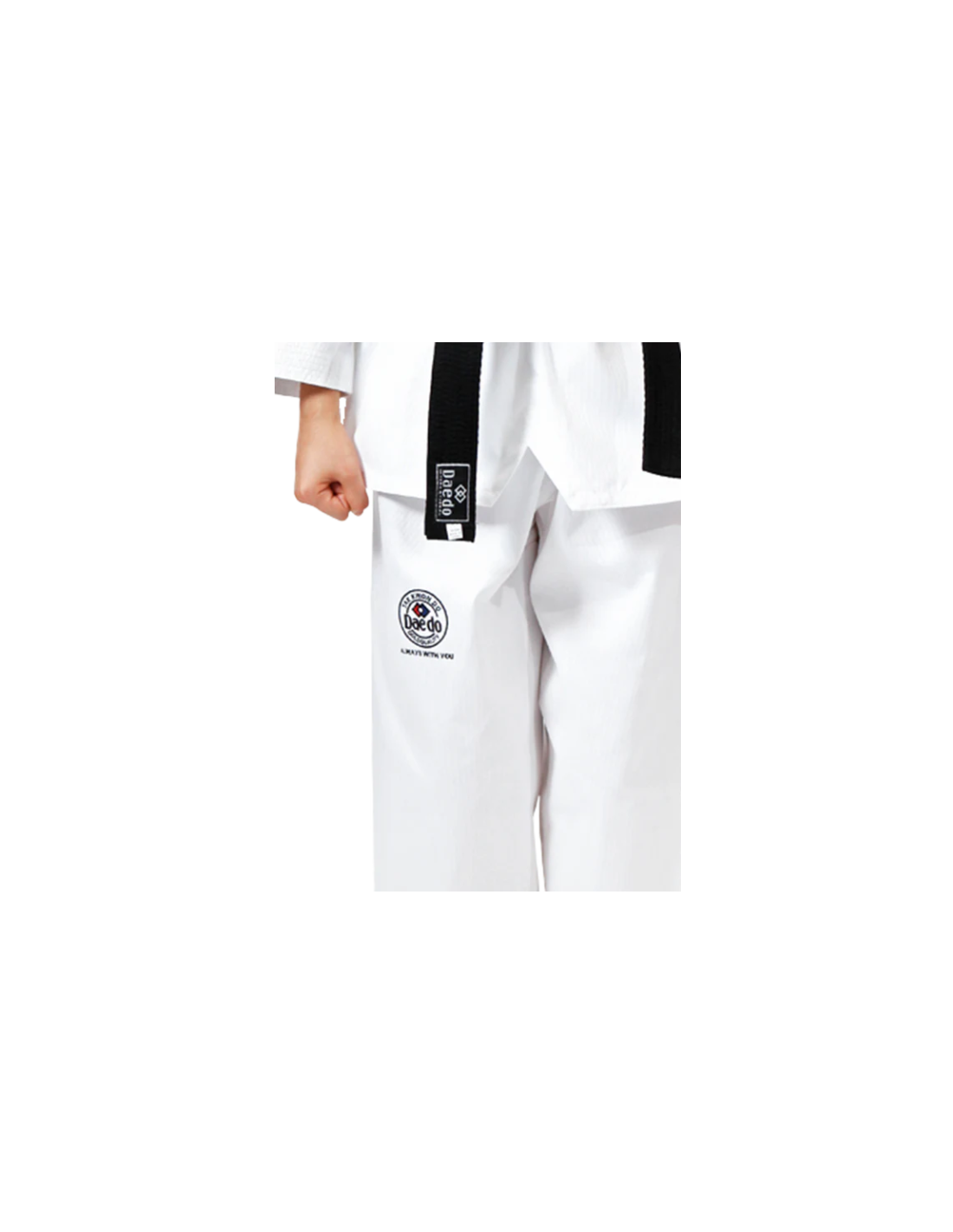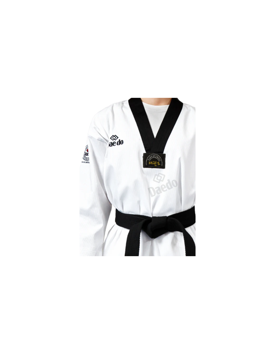 De Seoul Dobok Black Collar voor Taekwondo biedt comfort, duurzaamheid en bewegingsvrijheid, met zwarte kraag, “Daedo”-borduursels en “Taekwondo” op de rug. ????
